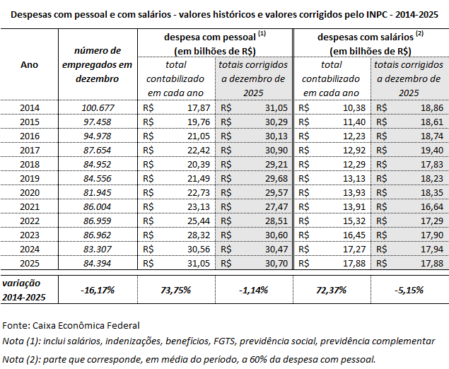 No período 2014-2025 houve redução no total das despesas com pessoal da Caixa, quando se atualiza monetariamente a dezembro de 2025, pelo Índice Nacional de Preços ao Consumidor (INPC), o montante contabilizado em cada ano. Em 2025, as despesas com pessoal totalizaram R$ 30,7 bilhões, valor 1,14% inferior ao de 2014 corrigido pelo INPC.