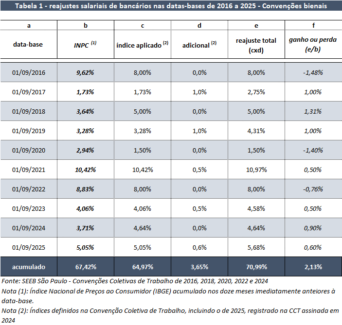 A variação do Índice Nacional de Preços ao Consumidor (INPC) acumulada no período de 1º de setembro de 2024 a 31 de agosto de 2025 alcançou 5,05%. Acrescentando-se a esse índice 0,6% de ganho real, percentual definido em Convenção Coletiva de Trabalho com vigência de setembro de 2024 a agosto de 2026, o reajuste total dos bancários, em 1º de setembro de 2025, é de 5,68%.