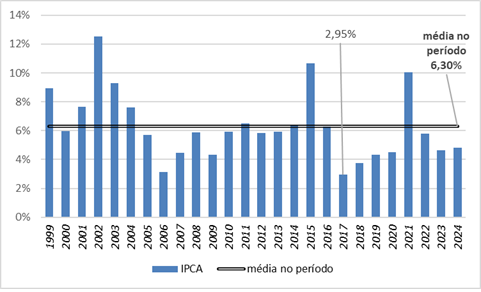 IPCA acumulado a cada ano e média no período – 1999 a 2024